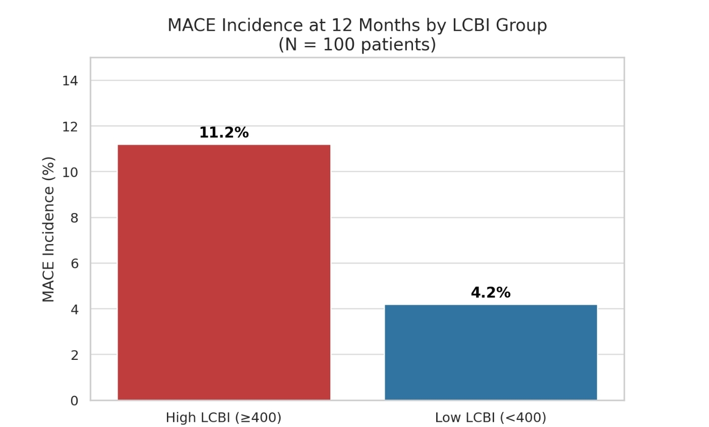 Patients were stratified into two groups based on LCBI values: high-risk (¡Ã400) and low-risk (<400). Event rates were compared using Kaplan-Meier analysis, and Cox proportional hazards modeling was used to assess the independent predictive value of LCBI.Among 100 patients (mean age 64¡¾9 years; 72% male), 23 % had a non-culprit lesion with LCBI ¡Ã400. At 12 month follow-up, the incidence of MACE was significantly higher in the high-LCBI group compared to the low-LCBI group 11.2% vs. 4.2%,.