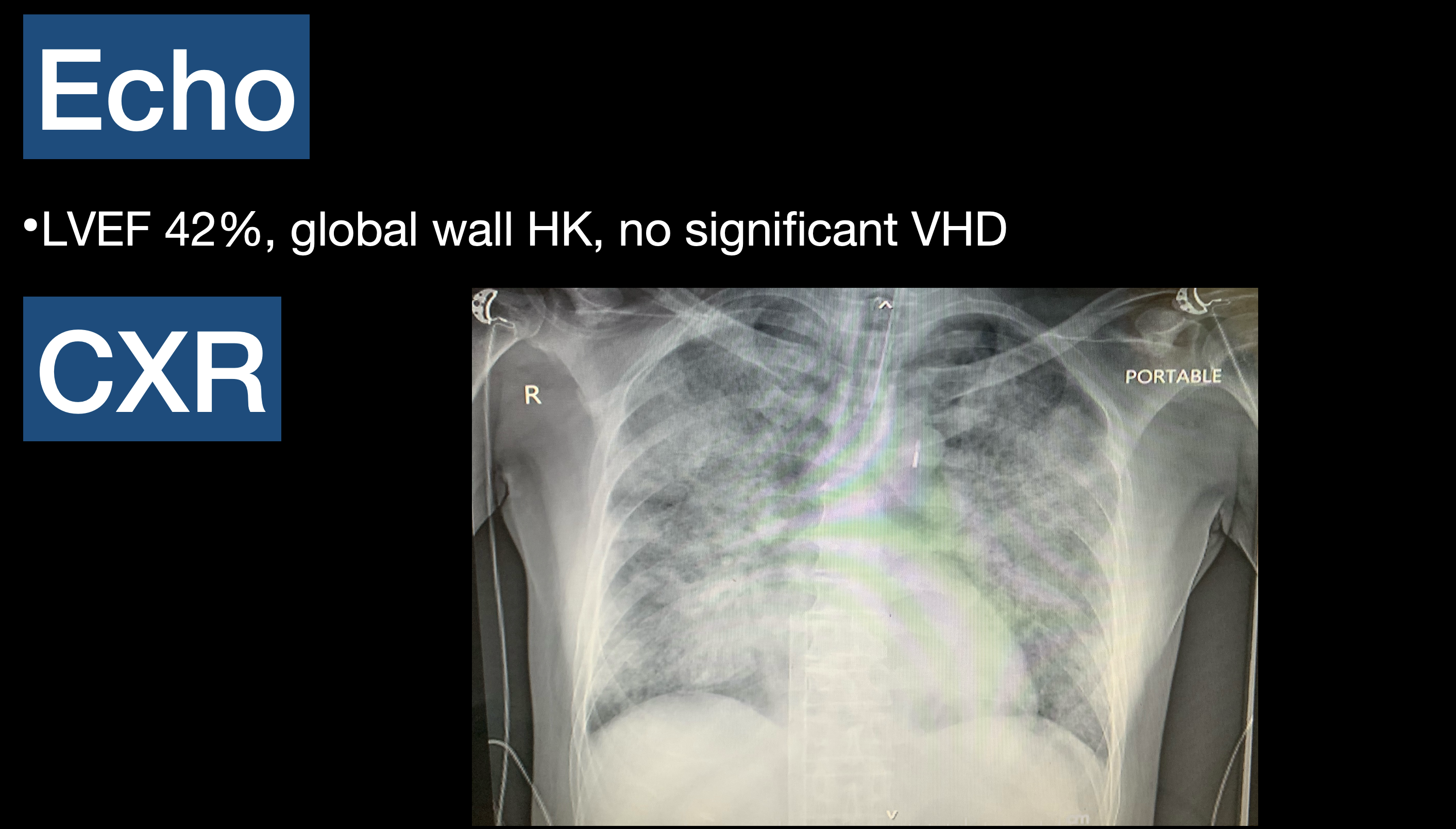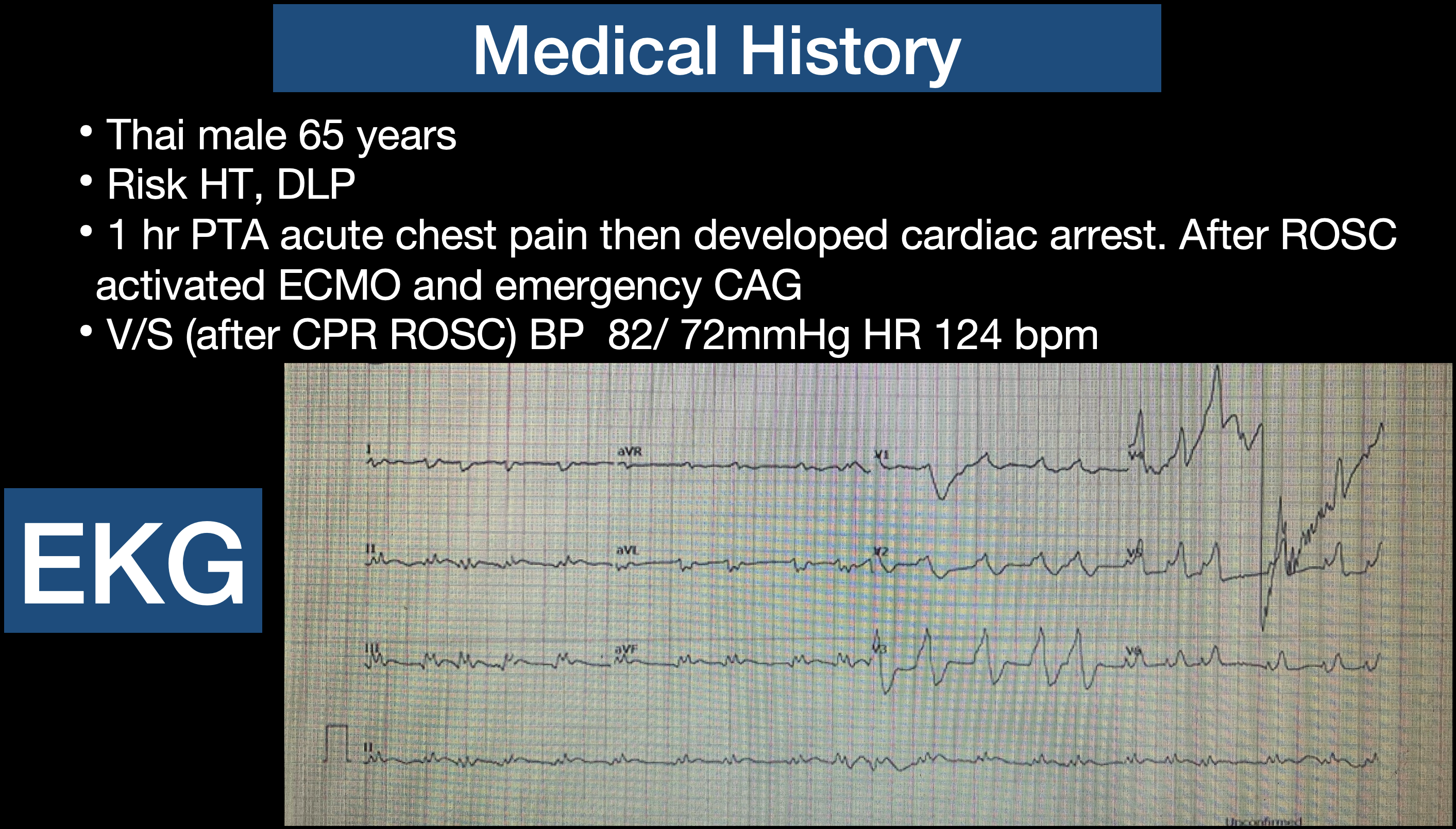 Thai male 65 years, Risk HT, DLP. Presented with 1 hr PTA acute chest pain then developed cardiac arrest. After ROSC activated ECMO and emergency CAG. After CPR ROSC, BP 82/ 72mmHg HR 124 bpm, heart totally regular, fine crepitation both lungs.