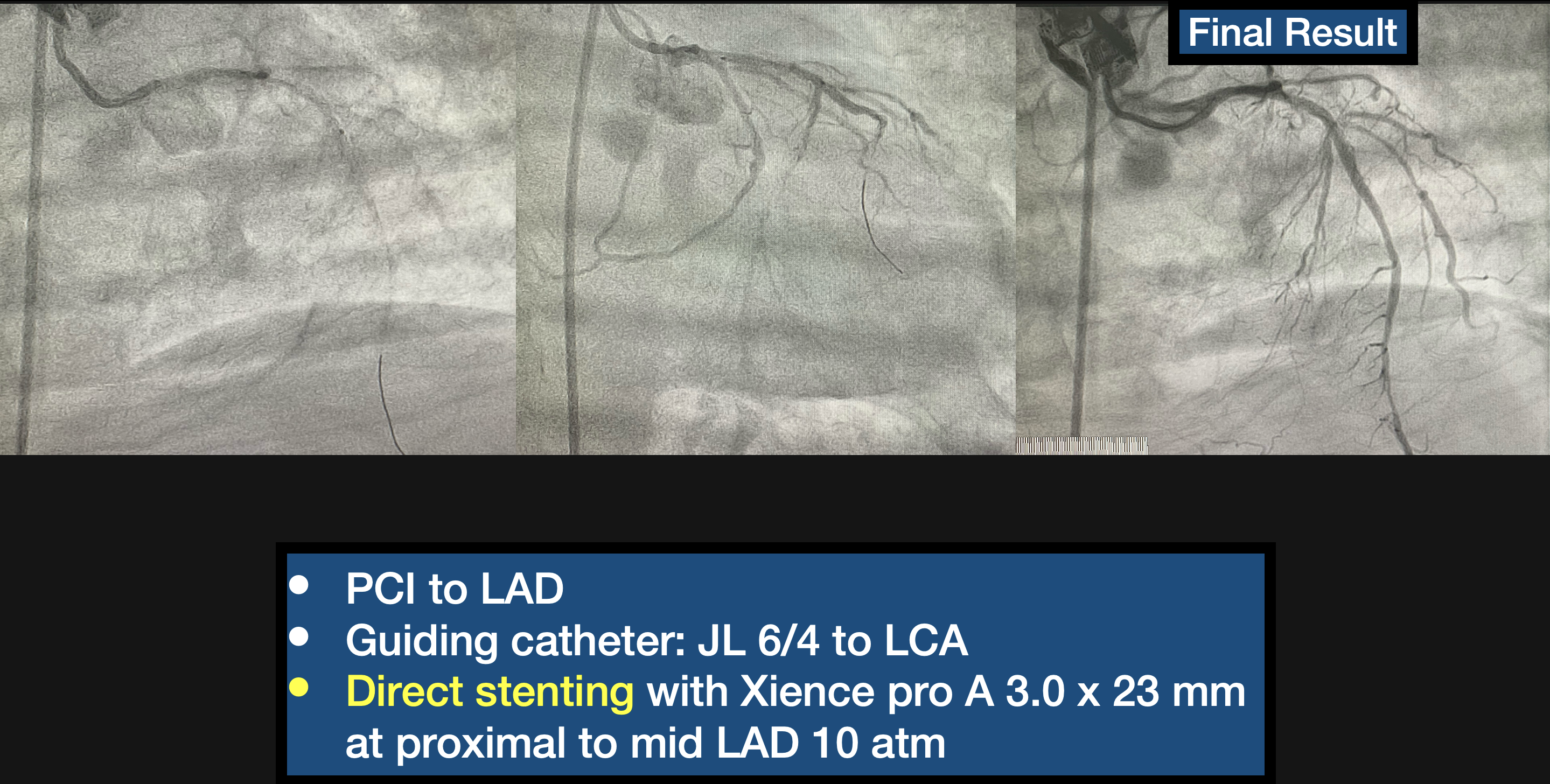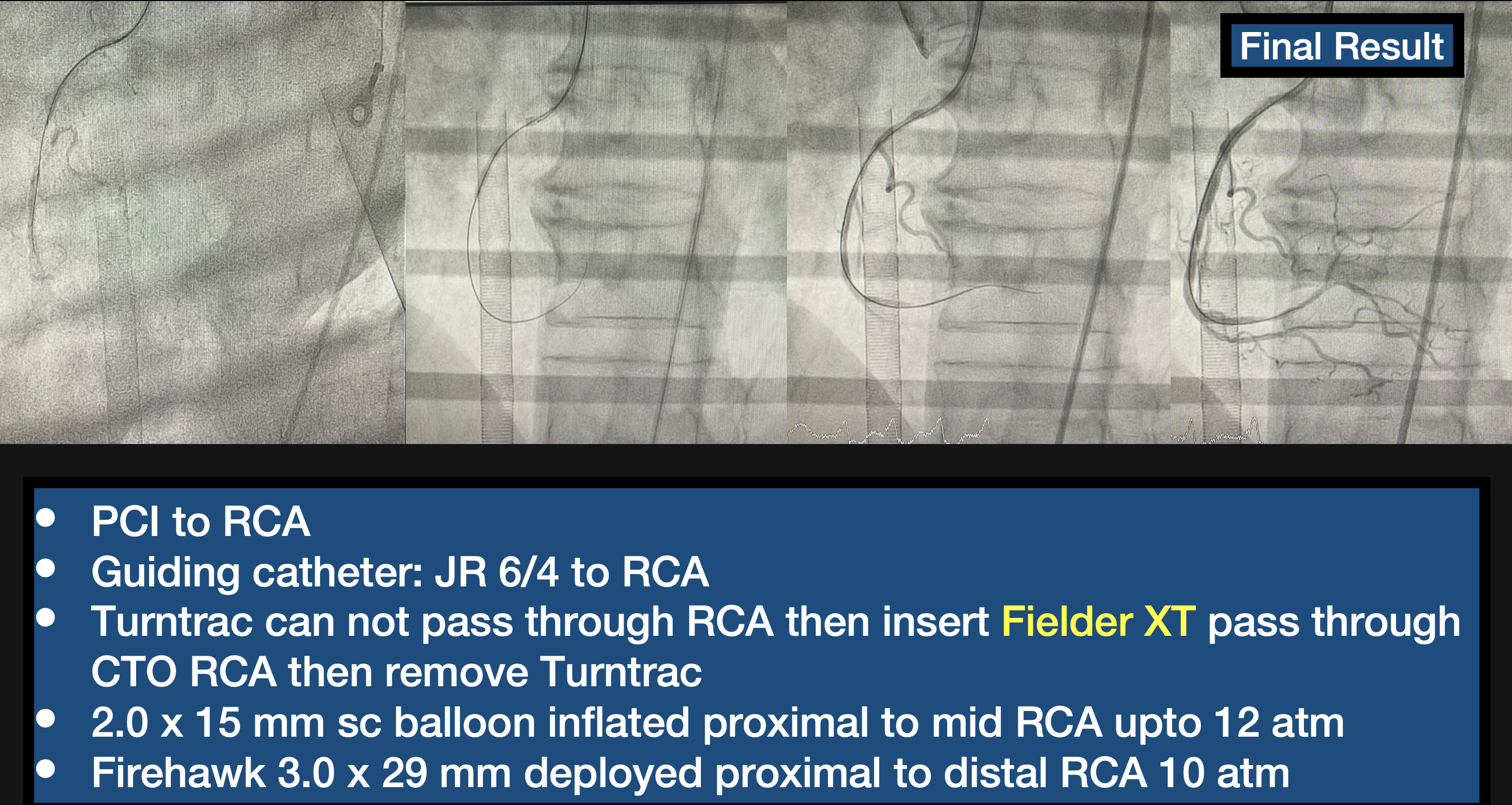 CAG via 7Fr RFA Sheath with Diagnostic catheter JL 4.0/6 Fr, JR 4.0/6Fr showed Rt dominant, LM: 30-40% stenosis distal LM, LAD: 80-90% stenosis proximal to mid LAD c filling defect, 70-80%stenosis DG1, LCx: subtotal occlusion small OM1, RCA: 20-30% stenosis proximal RCA, CTO mid RCA.PCI to LAD,Guiding catheter: JL 6/4 to LCA. Direct stenting with Xience pro A 3.0 x 23 mm at proximal to mid LAD 10 atm. PCI to RCA, Guiding catheter: JR 6/4 to RCA. Turntrac can not pass through RCA then insert Fielder XT pass through CTO RCA then remove Turntrac. 2.0 x 15 mm sc balloon inflated proximal to mid RCA upto 12 atm. Firehawk 3.0 x 29 mm deployed proximal to distal RCA 10 atm.