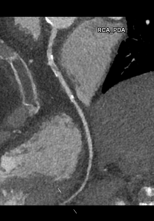Dominance: Right Left Main: No significant stenosis LAD: Mild distal disease LCx: Minor disease RCA: 80% in-stent restenosis at proximal segment; 80% calcified de novo stenosis at mid to distal RCA