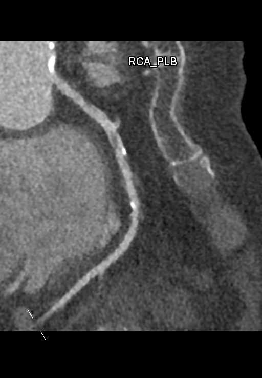 A 78-year-old woman with hypertension, hyperlipidemia, and a history of PCI to the right coronary artery with bare-metal stent placement in 2001 presented with a one-month history of stable angina. She underwent CT coronary angiography, which demonstrated moderate to severe in-stent restenosis in the RCA. She was admitted electively for coronary angiography and possible PCI. Physical examination was unremarkable, with no murmurs or signs of heart failure.