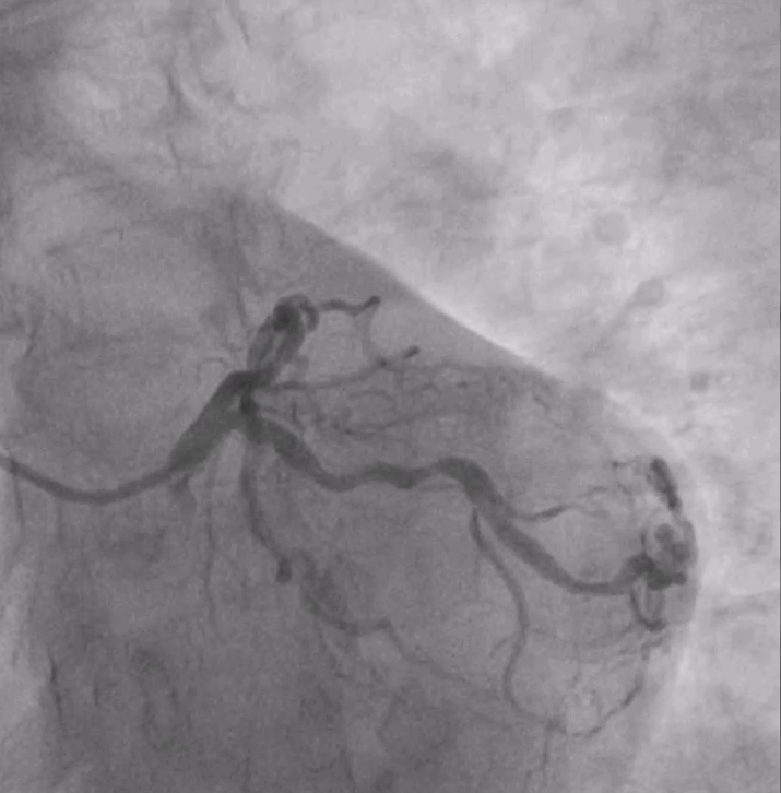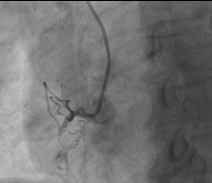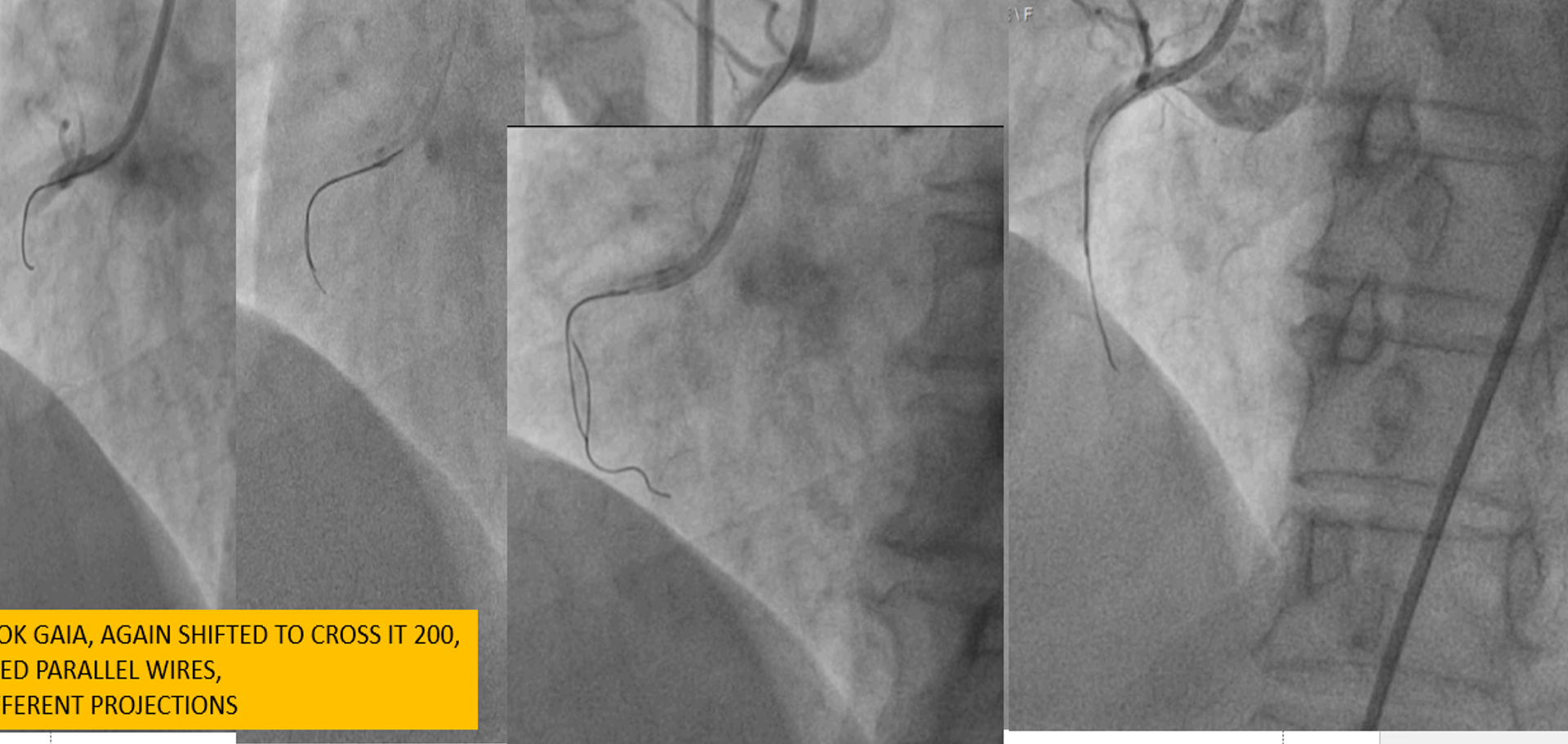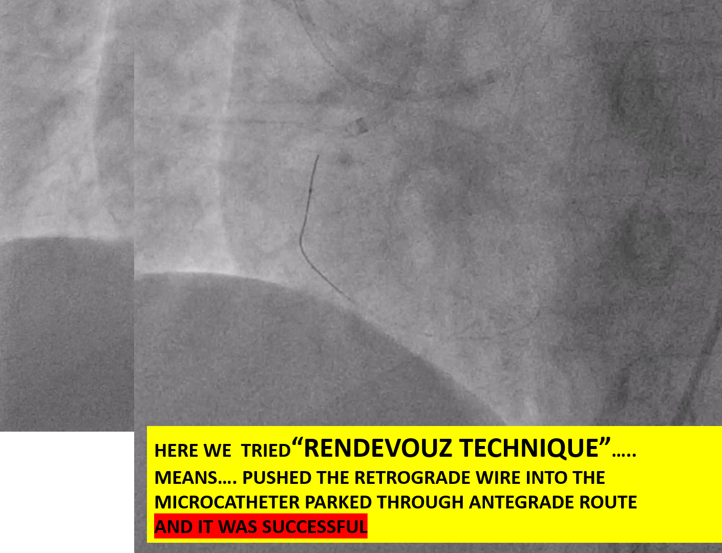 PTCA with Retrograde Rendezvous for Chronic Total Occlusion (CTO)An individual with a stubborn Chronic Total Occlusion (CTO) in the RCA (Right Coronary Artery) initially underwent a failed antegrade percutaneous transluminal coronary angioplasty (PTCA). Despite multiple wire attempts (e.g., CROSSIT 200, PILOT 150), the procedure was aborted due to a spiral dissection.A month later, a second attempt was made using a more advanced approach. The steps were as follows:Retrograde Access: The interventional team chose a retrograde approach, navigating a wire and microcatheter through collateral vessels to reach the RCA distal to the blockage.Antegrade Access: Simultaneously, an antegrade wire was advanced from the proximal end of the RCA to the blockage site.Rendezvous: The retrograde and antegrade wires were "kissed" at the site of the CTO. This crucial step, known as the rendezvous technique, allowed the antegrade wire to be precisely guided.Final Crossing: The antegrade wire was then advanced through the antegrade microcatheter, alongside the retrograde wire, finally penetrating the true lumen distal to the CTO.Revascularisation: Once the path was clear, the retrograde wire was removed. The RCA was then successfully revascularized with balloon dilations and the deployment of two stents.