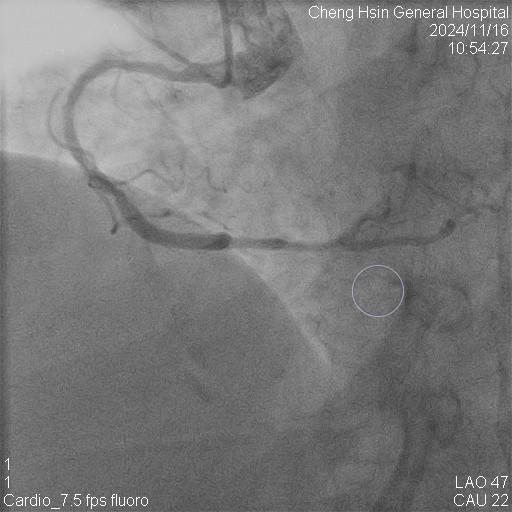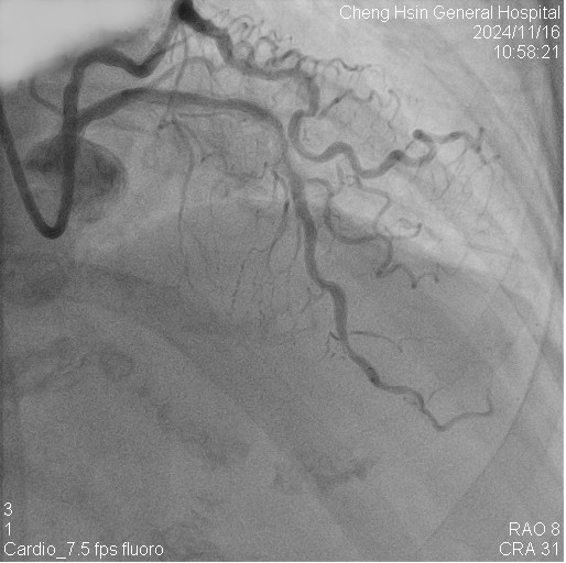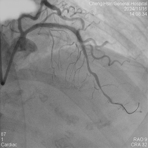 The RCA was calcified but no significantly severe stenosis.The LCX was calcified with mild stenotic lesion and a patent old stent.The LAD was severely calcified with an under-expanded old stent at middle to distal part. The lesion was also severely stenotic. The proximal to middle LAD had moderately stenotic lesion with calcification also.