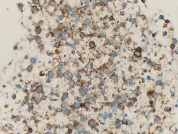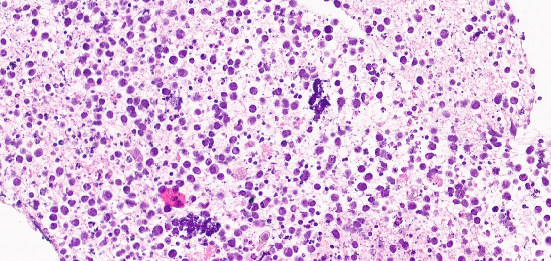 This mass was suspected to be malignancy then bronchoscopy with lymph node biopsy and bone marrow biopsy were done. Bronchoscopy with mediastinal lymph node biopsy were done. Lymph node tissue histopathology reported malignant small round cell tumor with positive for CD20, CD45, BCL-6 and C-MYC immunohistochemistry, suggestive of diffused large B-cell lymphoma. Finally, bone marrow tissue biopsy was done and histopathology reported hypercellularity involved by high-graded mature B-cell lymphoma leading to diagnosis of Non-Hogkin's lymphoma stage IV and promptly CHOP regimen chemotherapy treatment