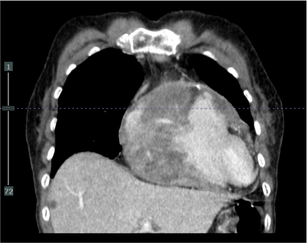 Echocardiogram accidentally found large anterior heterogeneous mass sized about 5x7 cm. This mass adjacent to right atrium (RA), right ventricle (RV) and tricuspid annulus causing mild to moderate tricuspid regurgitation (TR), no pericardial effusion. Chest CT was requested, reporting irregular-shaped heterogeneous anterior mediastinal mass sized 6.7x9x4.7 cm involving tricuspid valve, anterior wall of RA and RV. Right coronary artery (RCA) also passed through this mass.
