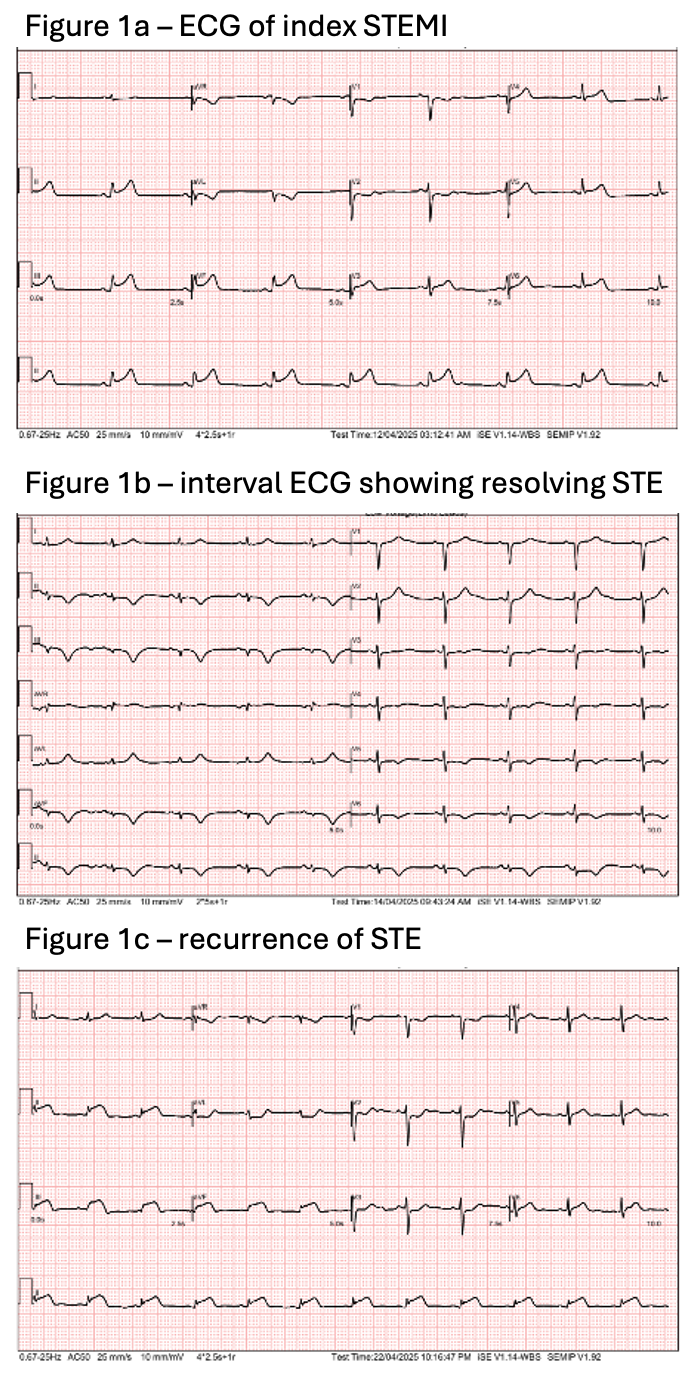 ECG of the patient showed recurrence of ST elevation over inferior leads (Figure 1). Echocardiogram revealed left ventricular ejection fraction (LVEF) of 50% with hypokinetic inferior wall.