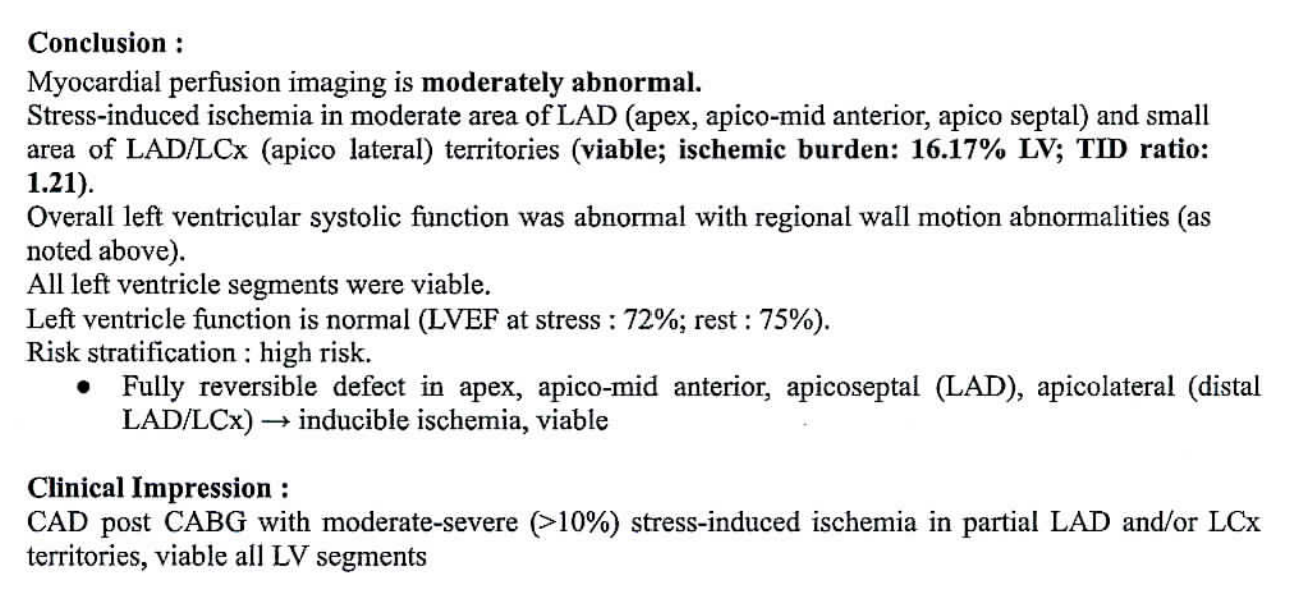 ECG was normal. Myocardial perfusion imaging revealed severe (>10%) stress-induced ischemia in partial LAD and/or LCx territories, with all LV segments remaining viable. Resting and stress LV ejection fraction was preserved.