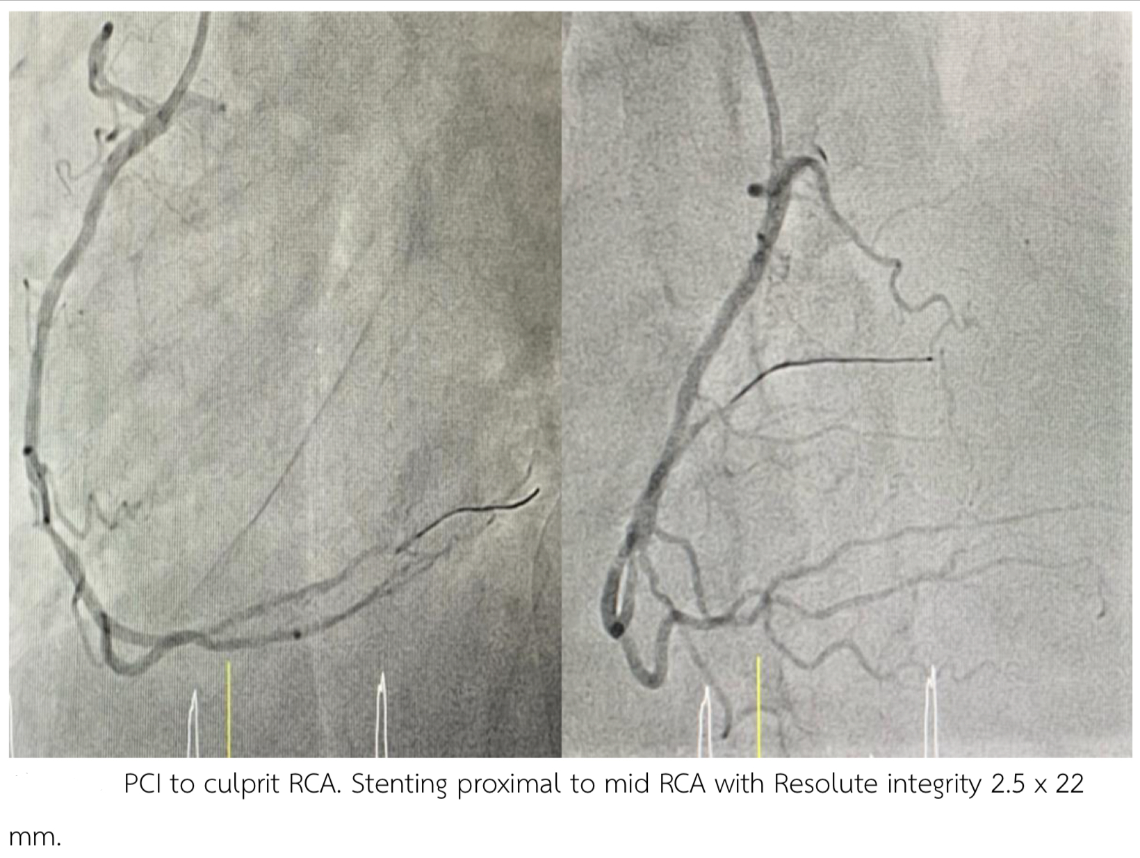 PCI to culprit RCA:Access right radial.Guiding Catheter: 5 Fr Ikari guiding catheterStenting proximal to mid RCA with Resolute integrity 2.5 x 22 mm upto 12 atm.