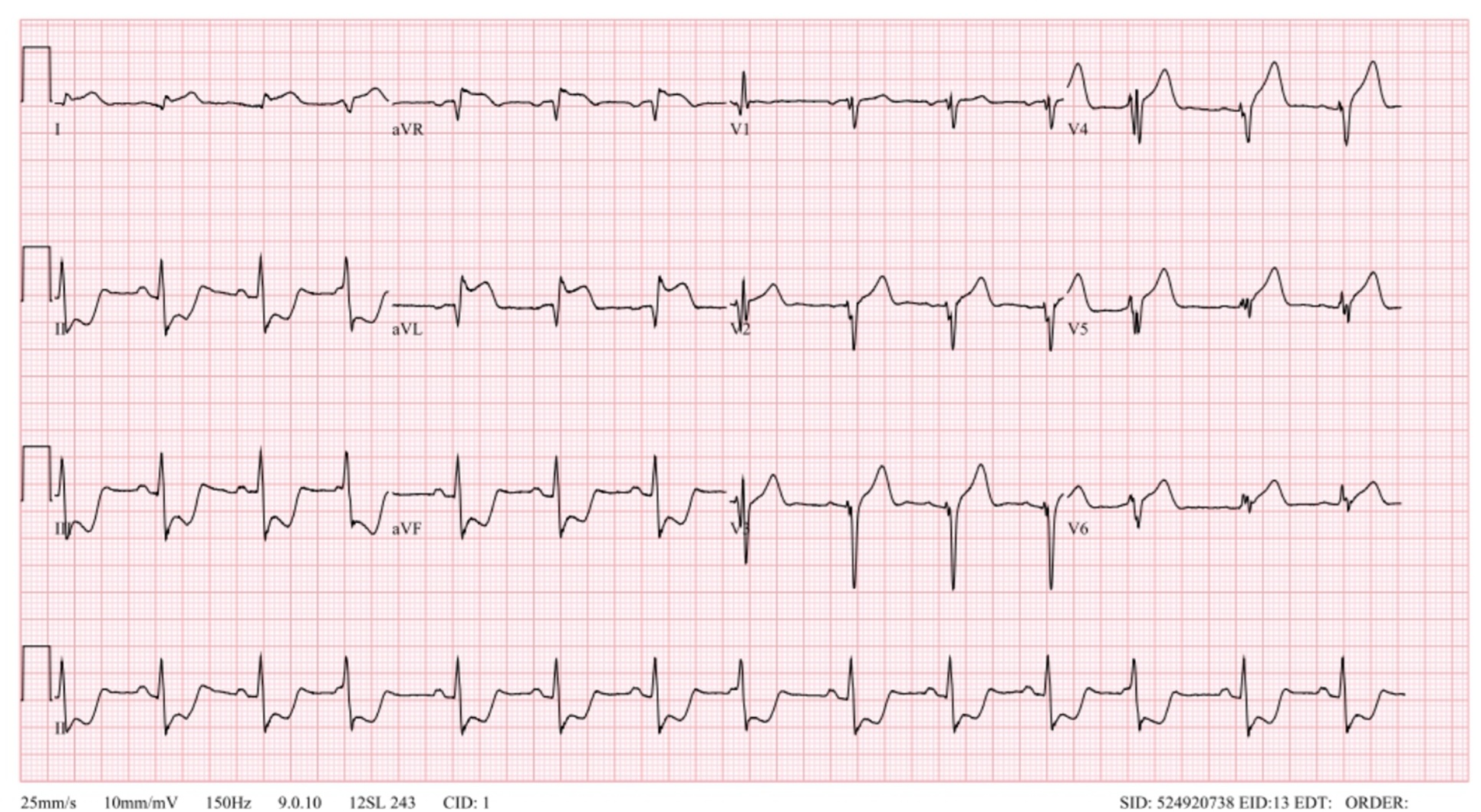 A 70-year-old female patient complaining of squeezing chest pain was admitted to the emergency department, shortly after which she collapsed. She regained consciousness and became slightly drowsy while measuring the vital signs, which showed a blood pressure of 65/43 mm Hg and heart rate 82 bpm. After IV fluid and norepinephrine administration, her blood pressure recovered to 90/54 mm Hg.
