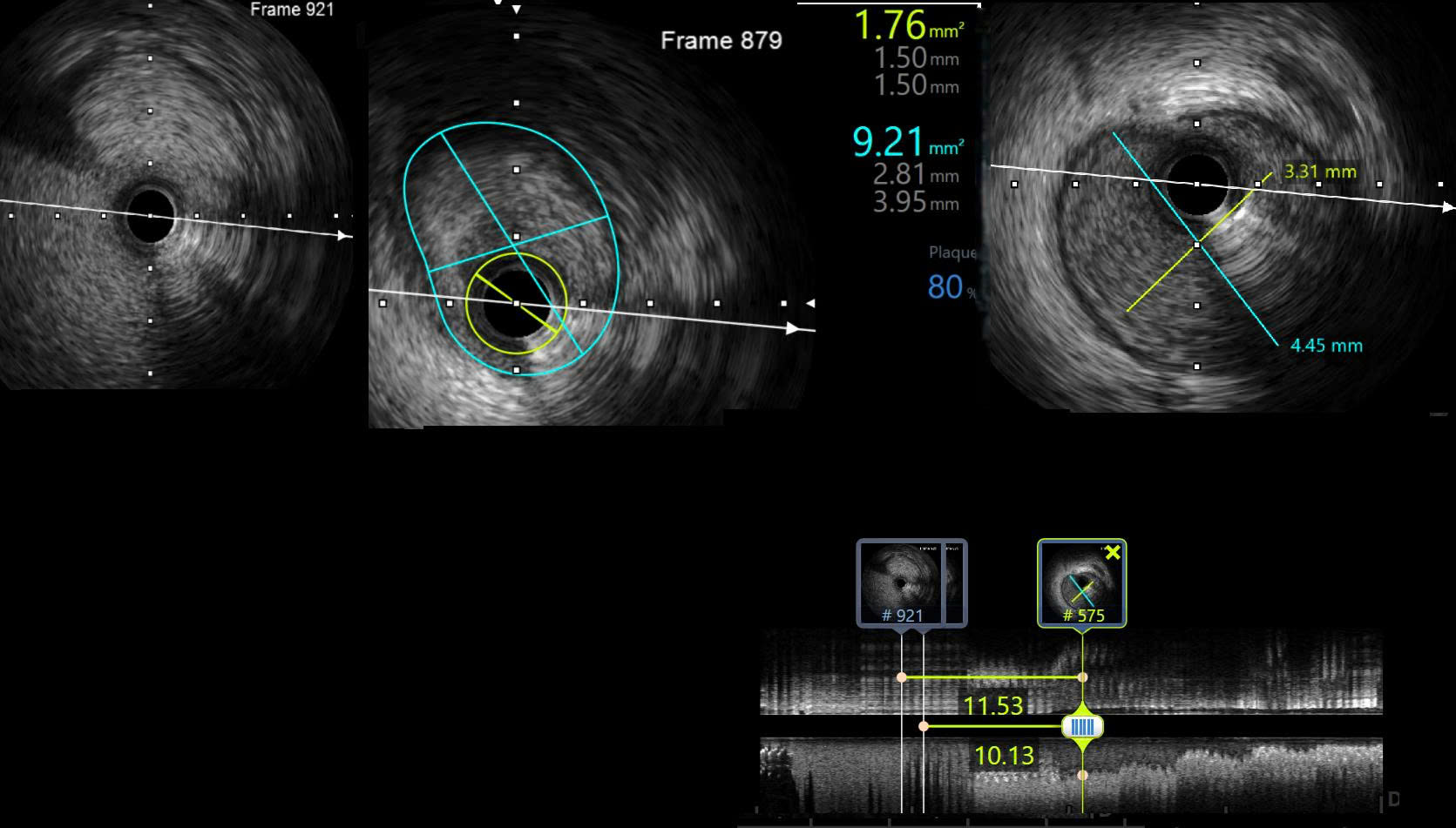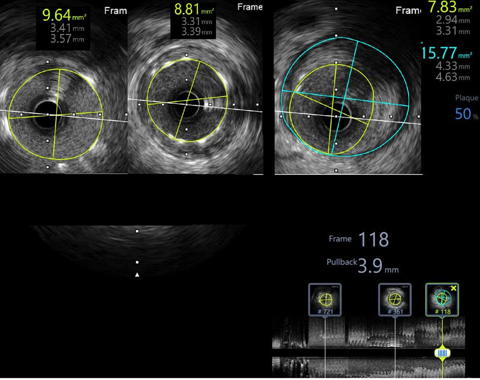 DSA and IVUS pre-intervention showed lesion located from proximal LAD to the ostium with the length of 12 mm, distal reference vessel diameter of 3.3 mm, vessel diameter of 4.4 mm. The lesion had an area of 1.76 mm2 with plaque burden of 80 %.