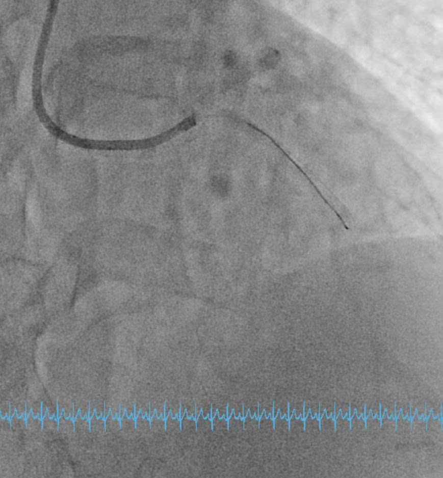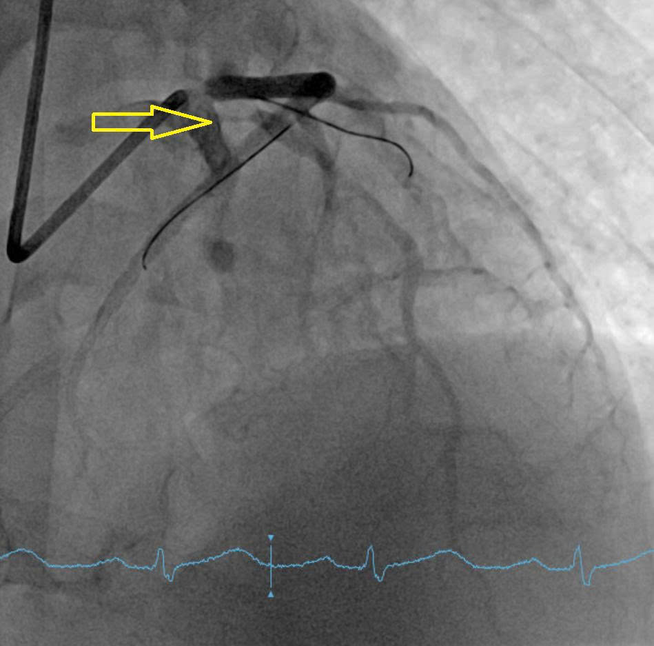 Engage the guiding catheter into the LCX ostium and advance a wire for anchoring in the LCX. After withdrawing the guiding catheter from the ostium and performing coronary angiography, it was observed that the LAD ostium originated separately from the LCX ostium and was located lower in the RAO–CRA view.Multiple attempts to selectively wire the LAD ostium using a 6 F SPB 3.0 guiding catheter (Asahi, Japan) from outside the LAD ostium were unsuccessful. The guiding catheter was then exchanged for a 6 F JL 3.5, and a Sion Blue wire was successfully advanced through the LAD ostium into the distal segment.DSA and IVUS post-intervention showed minimal stent area of 8.83 mm2, reached 112 % of distal reference vessel diameter. Stent covered LAD ostium with an area of 9.64 mm2 and was 2 mm inside the aortic artery. There was no protrusion, no dissection.