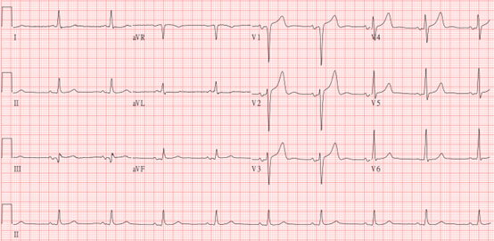 A 59-year-old man with dyspnea on exertion for a month was admitted for scheduled percutaneous coronary intervention. His medical history included hypertension, hyperlipidemia, and type 2 diabetes. He also had 2-vessel coronary artery disease with a bare metal stent each in the right coronary and the left anterior descending arteries. Physical examination was unremarkable except for being slightly overweight; ECG showed sinus bradycardia and chest x-ray excluded severe pulmonary disease.