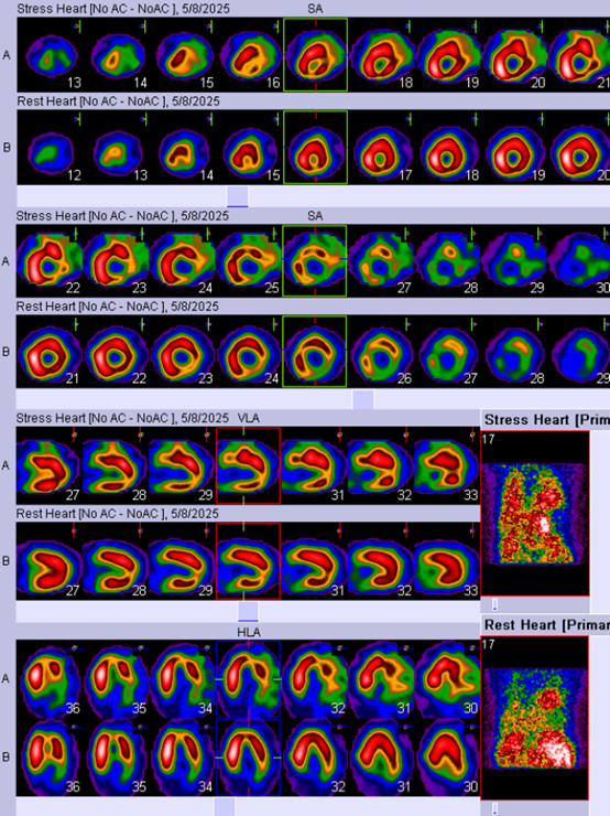 Laboratory findings indicated no blood dyscrasia; liver/renal function tests were within normal limits, and there was no electrolyte imbalance. Myocardial perfusion scan found an ejection fraction of 50% both at rest and during stress; the test also suggested that there were possible lesions affecting all three coronary arteries.