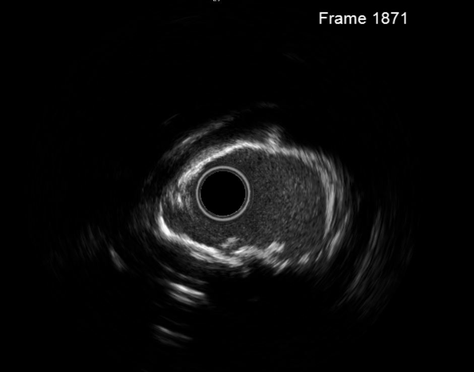 Given the balloon-uncrossable lesion, rotational atherectomy was considered necessary to facilitate stent delivery and proper expansion. However, the heavily calcified plaque was located at a curvature of the RCA, raising the risk of complications with multiple burr passes. In addition, the patient¡¯s cardiac and renal function was compromised, and even minor complications could have resulted in life-threatening consequences. Therefore, a combined strategy of rotational atherectomy and intravascular lithotripsy (IVL) was planned after thorough discussion.A temporary pacemaker was placed first as backup before initiating the procedure. The microcatheter could not cross the lesion, thus a direct wiring technique with a RotaWire was performed. Rotational atherectomy was carried out with a 1.25 mm burr at high speed (176,000–178,000 rpm). Episodes of bradycardia occurred but the lesion was successfully crossed. Intravascular ultrasound (IVUS) revealed severe calcification with 270¡Æ arc in the distal LAD and 360¡Æ in the mid LAD, with partial fracture. IVL was delivered to the distal RCA, followed by liquefaction of the calcium from d-RCA to m-RCA. Non-compliant balloon predilatation was then performed, and repeat IVUS confirmed multiple cracks with significant luminal gain. Two drug-eluting stents were deployed according to measurement from IVUS. After adequate post-dilatation, IVUS confirmed optimal stent expansion with good apposition and no edge dissection.