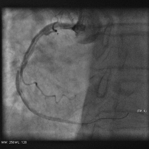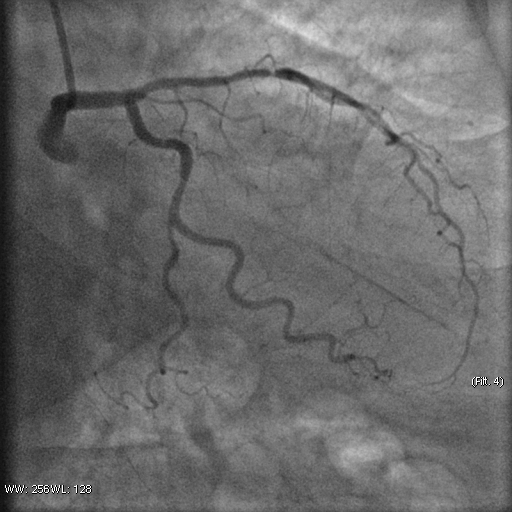 A guiding catheter JR 3.5 6Fr was inserted along a 0.035" 260.0 cm guidewire. The guidewire was removed. The right coronary artery was catheterized. A 7Fr Y-click connector (complete with an insertion device and a guidewire rotation device) was connected to the guiding catheter. A coronary guidewire Whisper ES 0.014" 190 cm, Asahi Gaia Third 0.014" 190 cm was inserted and brought into the orifice of the right coronary artery. The guidewire was inserted beyond the lesion zone of the right coronary artery in segment 2, then into the distal sections. Wilma NC 2.00*20.0 mm and Wilma NC 3.00*15.0 mm balloon catheters were inserted alternately along the coronary guidewire - predilation of the lesion zone of the right coronary artery in segment 2 was performed. Inflation of balloon catheters 14 atm. with an inflator, the balloon catheters are deflated and removed. A stent is inserted along the coronary guidewire - the Yukon Chrom PC 3.0 * 28.0 mm system, Yukon Chrom PC 3.0 * 28.0 mm, Cid Cre 8 3.50 * 25.0 mm, Cid Cre 8 4.0 * 16.0 mm - the stent is implanted in the lesion area of the right coronary artery in the 2nd segment. Inflation of the balloon catheter 9-16 atm. with an inflator, the balloon catheter is deflated and removed. Control coronary angiography - blood flow in the stenting zone is TIMI3, there are no signs of dissection or stent dislocation.