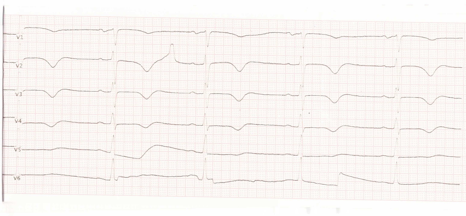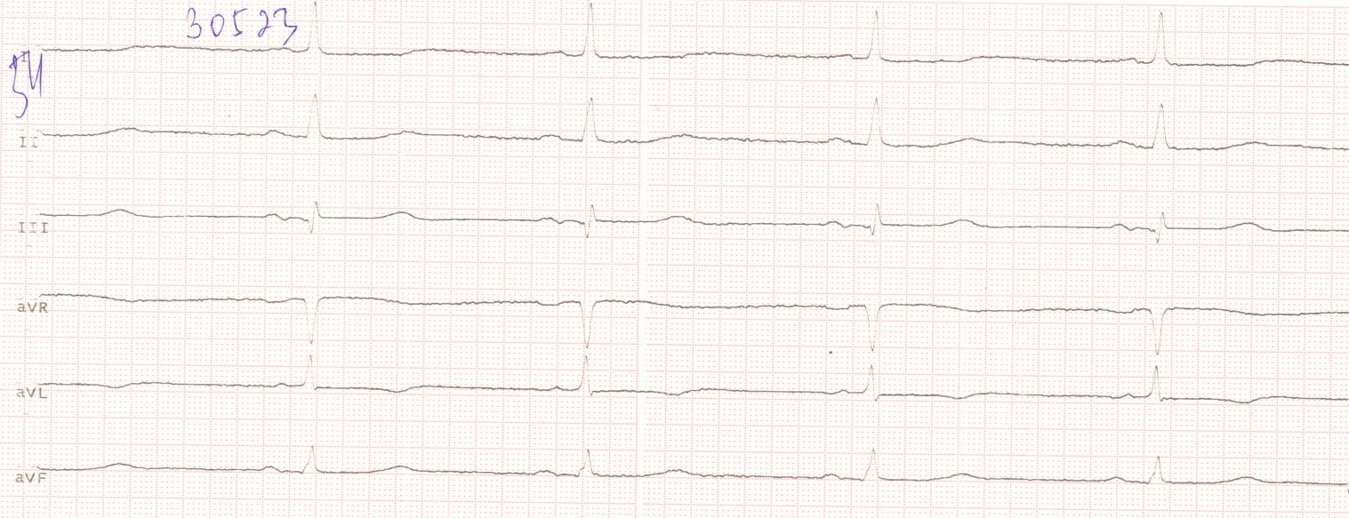 Sinus rhythm, heart rate 54 beats/min. Bradycardia. EOS is not deviated. Violation of repolarization processes due to ischemia in the myocardium of the anterior-septal-apical region of the left ventricle.