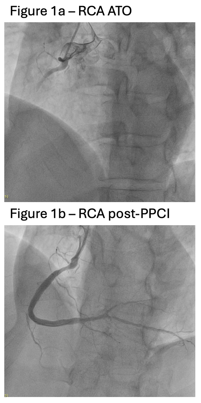 The LM was engaged with 6Fr EBU3.5 guiding catheter via RFA. Boluses of Eptifibatide were given. Aspiration thrombectomy was performed with Eliminate, yielding a considerable amount of thrombi. The LAD lesion was pre-dilated with SC 2.0 balloon. The patient then developed further decompensated cardiogenic shock requiring high dose inotropes, and intra-aortic balloon pump (IABP) was inserted (Video 3).Intravascular ultrasound (IVUS) of the LAD confirmed showed evidence of plaque rupture over proximal LAD (Video 4). The lesion was further pre-dilated with NC 3.0 balloon, followed by stenting by Ultimaster nagomi 3.5/28 and 3.0/24. Post-dilatation was performed with NC 3.0, NC 3.5, and NC 3.75 balloons sequentially. Angiogram and IVUS revealed excellent results (Video 5).