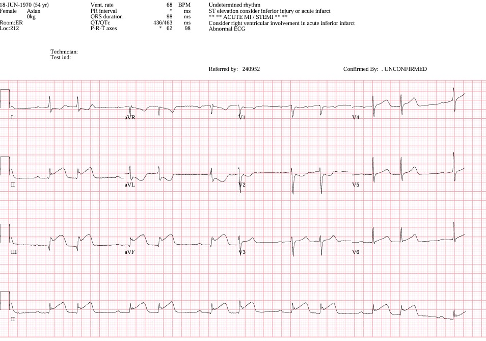 A 54-year-old female with a 10-year history of rheumatoid arthritis presented with acute chest pain persisting for 6 hours. She had no prior history of coronary artery disease, diabetes, or hypertension. On arrival, she appeared distressed with diaphoresis and hypotension. Blood pressure was 86/60 mmHg, heart rate 68 bpm, and oxygen saturation 92% on room air. ECG demonstrated ST-segment elevation in the inferior leads, consistent with acute inferior STEMI.