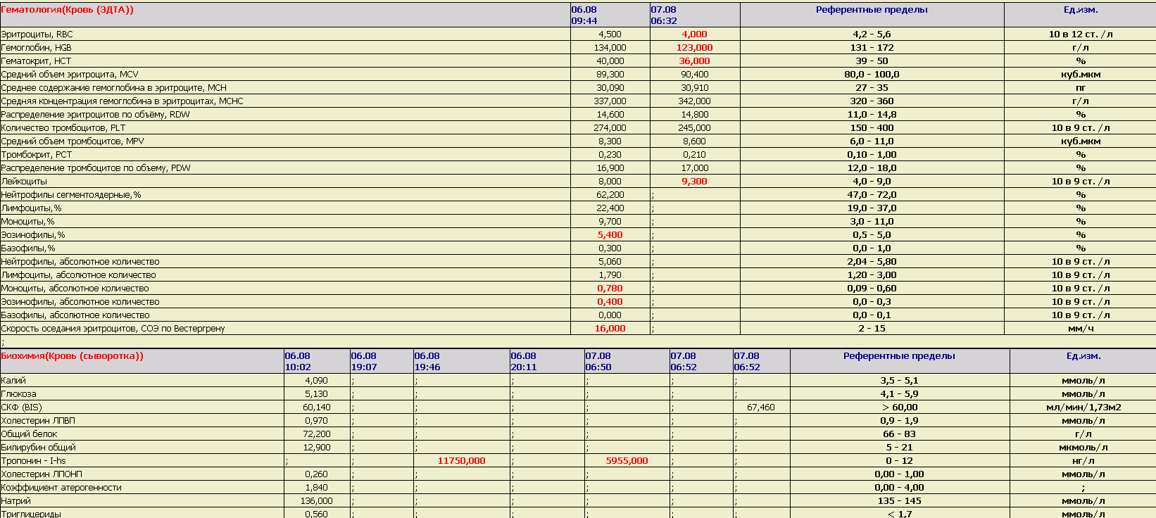 The patient had a stress test –bicycle ergometry – outpatiently, the results of which were positive. The test was not completed. Itwas stopped at seventy five (75) Wolt because of complaints of pressing,squeezing pain in the heart region. Horizontal depression of the ST segment was registeredin leads II,III, aVF down to a maximum of 2.1 mm. Single atrial extrasystoles were also registered.