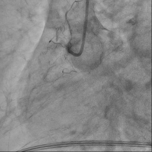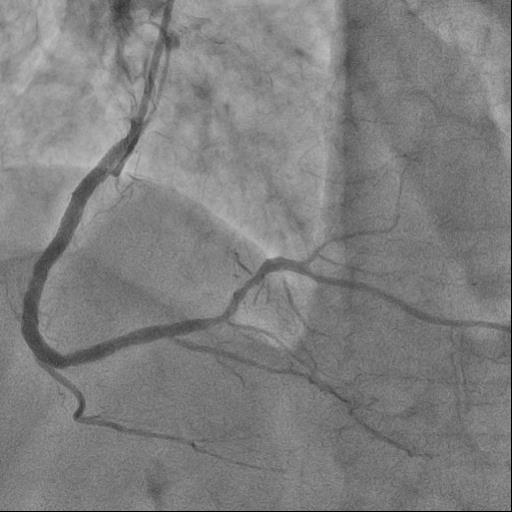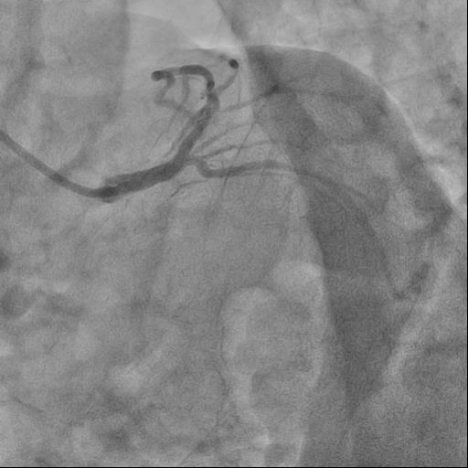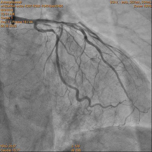 Angiography Right coronary artery dominance LEFT CORONARY ARTERY (LCA): trunk of the left coronary artery: uneven contours along the entire length. Left Anterior descending artery (LAD): uneven contours, stenosis in medial part by 80%. Circumflex artery (LCX): uneven contours along the entire length. RIGHT CORONARY ARTERY (RCA): uneven contours in the proximal segment, ¬³hronic total occlusion, the post-occlusionportion is fairly filled through intersystem collaterals.