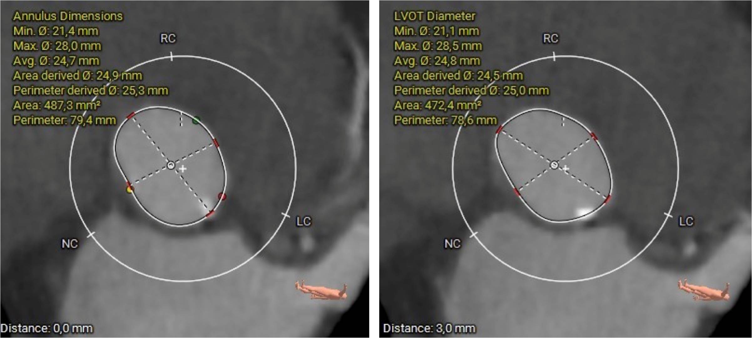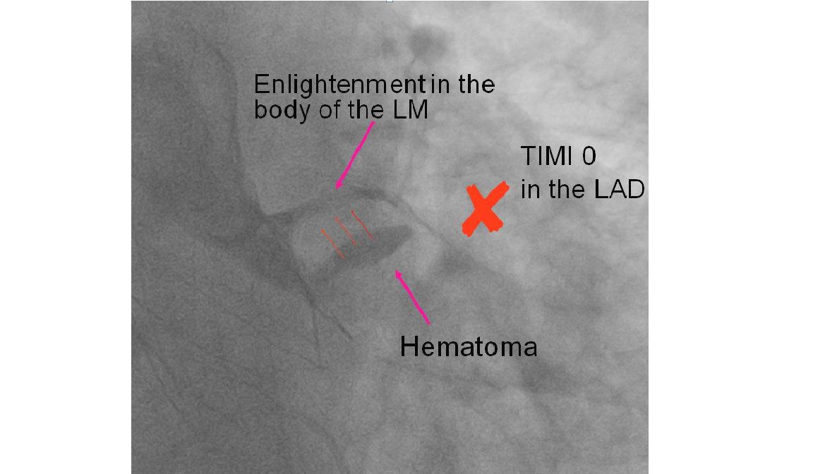 A super-rigid guidewire was inserted into the left ventricular cavity, and a valvulotomy was performed using a 23x40mm balloon catheter. After this, a successful implantation of a Portico 29mm aortic prosthesis was performed. During suturing of the access site, the patient developed persistent hypotension and bradycardia. A decision was made to perform catheterization of the left coronary artery trunk. During the angiogram, compression of the left coronary artery trunk by a hematoma in the projection of the fibrous ring was revealed. A decision was made to perform stenting of the left coronary artery trunk. The stent was successfully implanted in the left coronary artery trunk. Hemodynamics were restored. The patient was discharged on the 4th day after TAVI. A control MSCT was performed several months later.