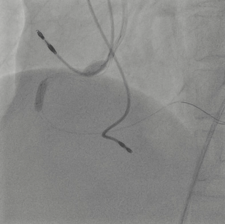 The patient was an 80-year-old woman with ahypertension, dyslipidemia, and permanent pacemaker implantation for completeatrioventricular block. She presented to another hospital with resting chestpain. The coronary computed tomography revealed severe stenosis or occlusion inthe right coronary artery (RCA), and she was referred to our hospital with adiagnosis of unstable angina.
