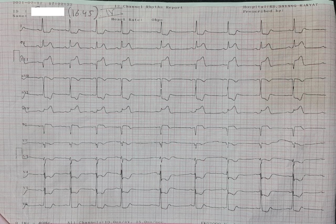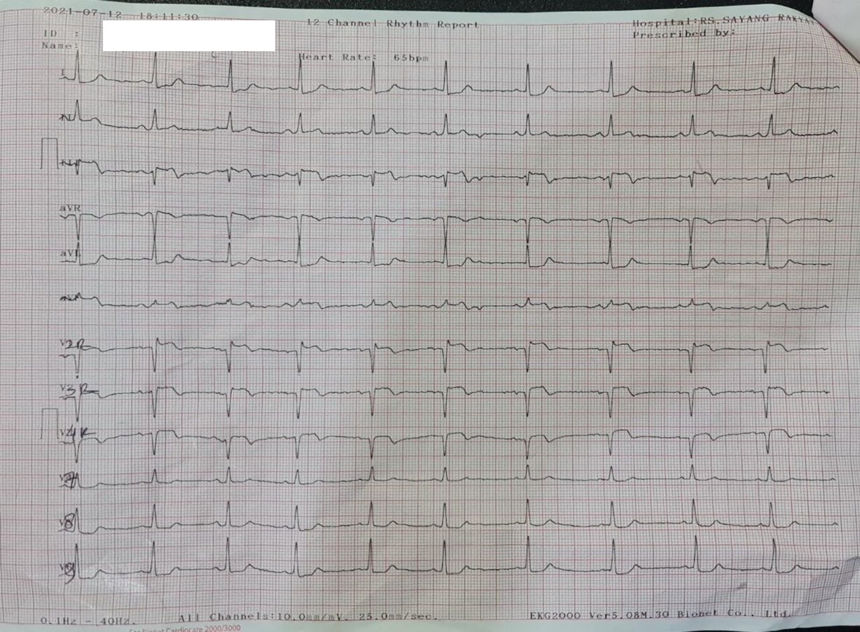Electrocardiography demonstrated sinus rhythm with ST-segment elevation in leads II, III, aVF, and right-sided precordial leads (V3R–V4R), with reciprocal ST-segment depression in leads I, aVL, and V5–V6, consistent with acute inferior wall myocardial infarction with right ventricular involvement. Initial laboratory testing revealed elevated high-sensitivity troponin T.