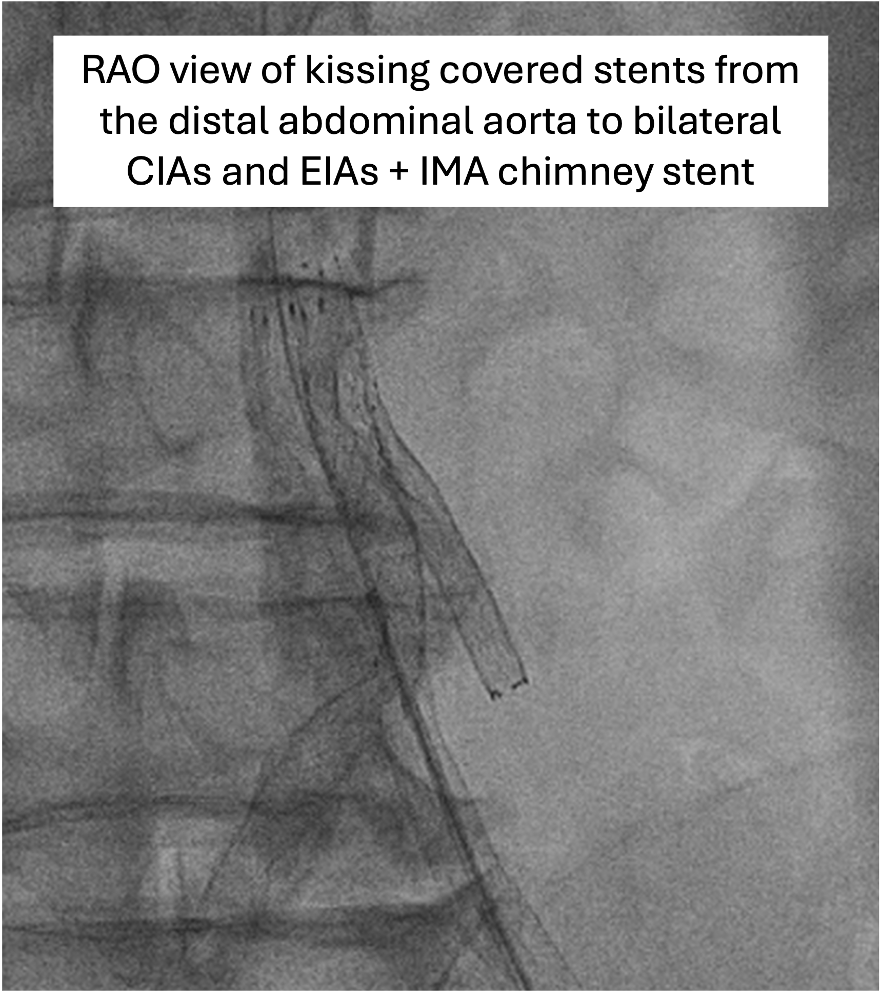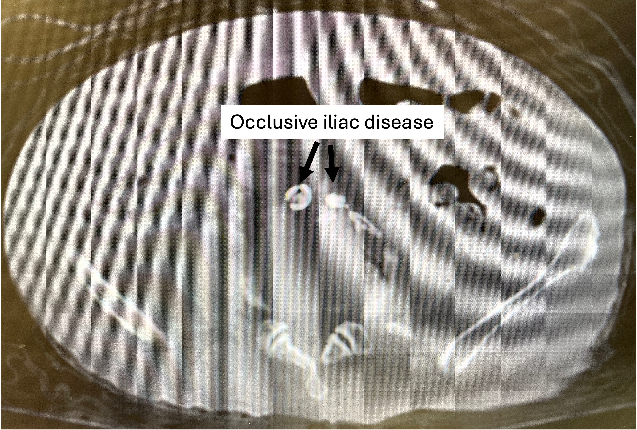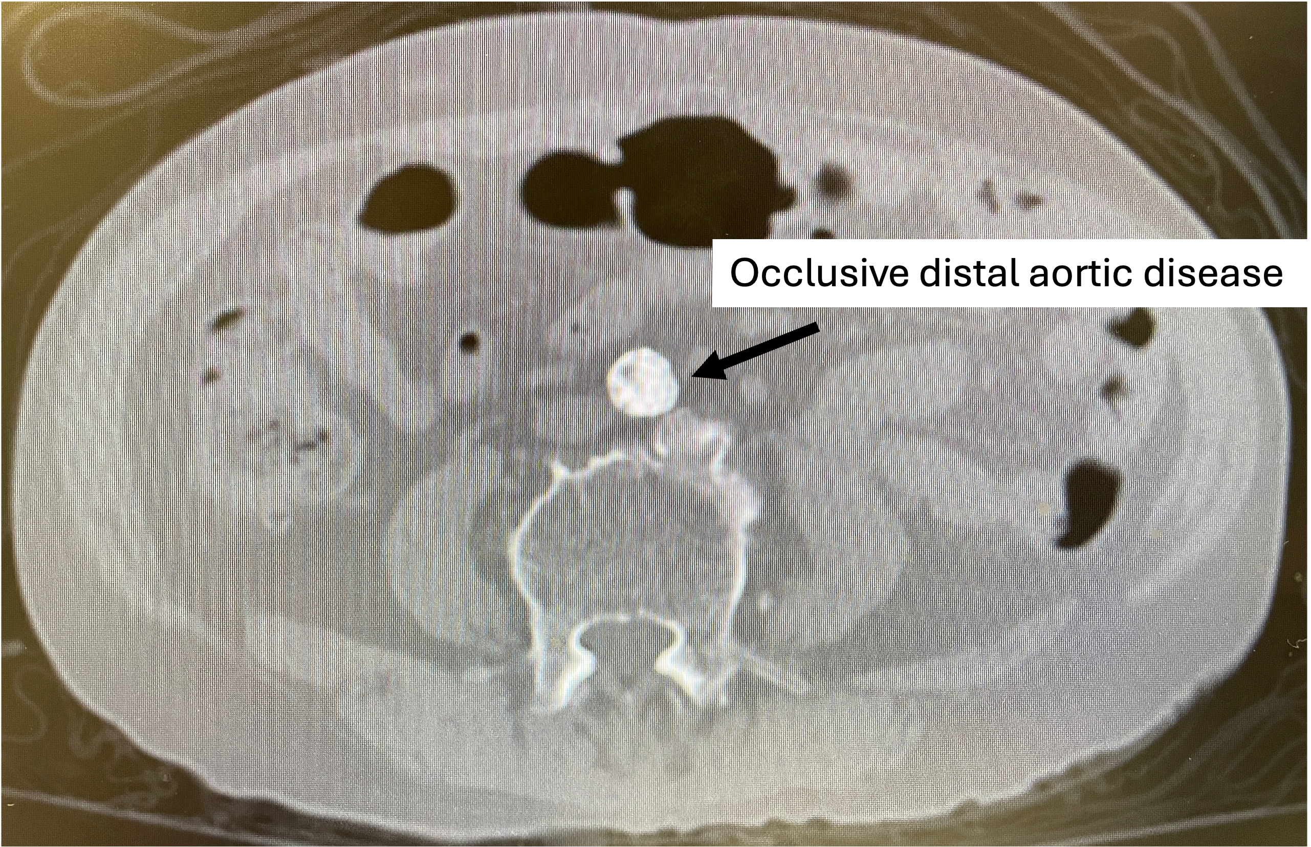 ECG showed RBBB. Haemoglobin was 12g/dL, creatinine 97umol/L, and troponin peaked at 13076ng/L (reference <34). TTE showed severe LV dysfunction (LVEF 25%) with preserved RV function and moderate functional mitral regurgitation. After a period of medical therapy, cardiac MRI showed LVEF improved to 40% with evidence of a previous infarct but viable myocardium. CT showed porcelain aorta and severe aortoiliac disease with occlusions in the infrarenal aorta and bilateral common iliac arteries.