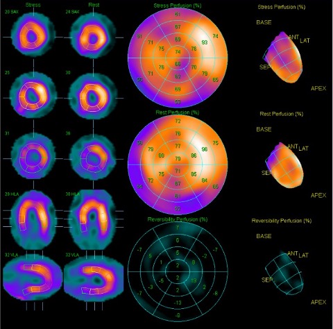 His ECG showed sinus rhythm with old inferior myocardial infarctions. CXR showed cardiomegaly otherwise unremarkable. Transthoracic echocardiography revealed preserved LV systolic function, competent valves function and LV posterior wall hypokinesis. Thallium scan revealed ischemia for left anterior descending artery and right coronary artery.
