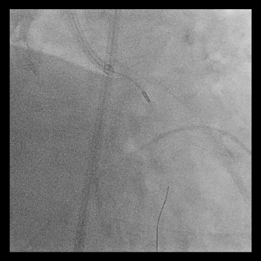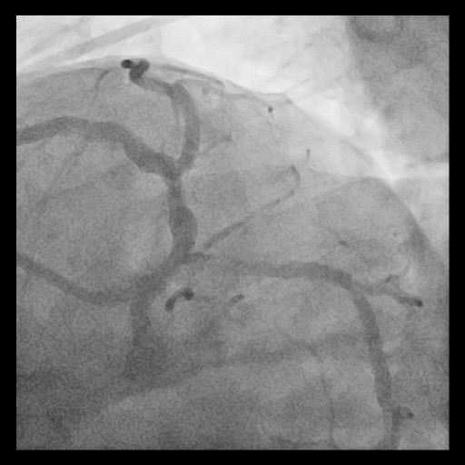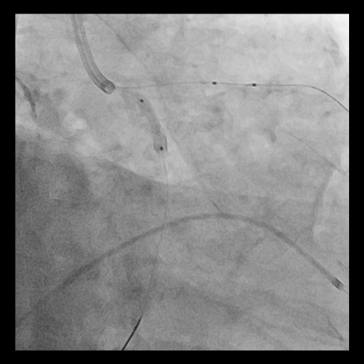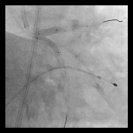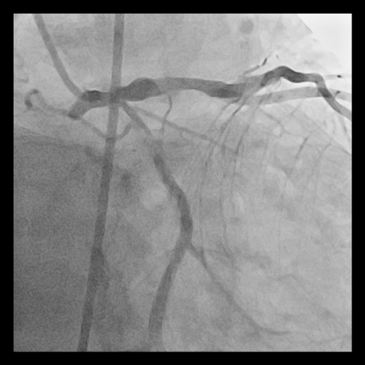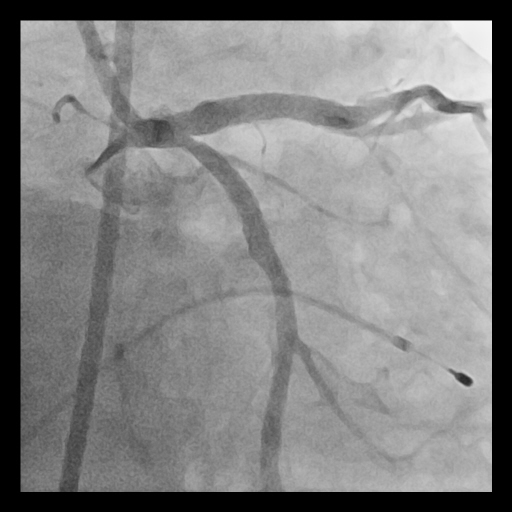 Coronary angiography showed long, tram-track dense calcification involving the left main bifurcation with subtotal occlusion of proximal LCx and diffuse proximal LAD disease. The calcified plaque exhibited significant radiopacities visible before contrast injection, suggesting a deep concentric calcium burden.